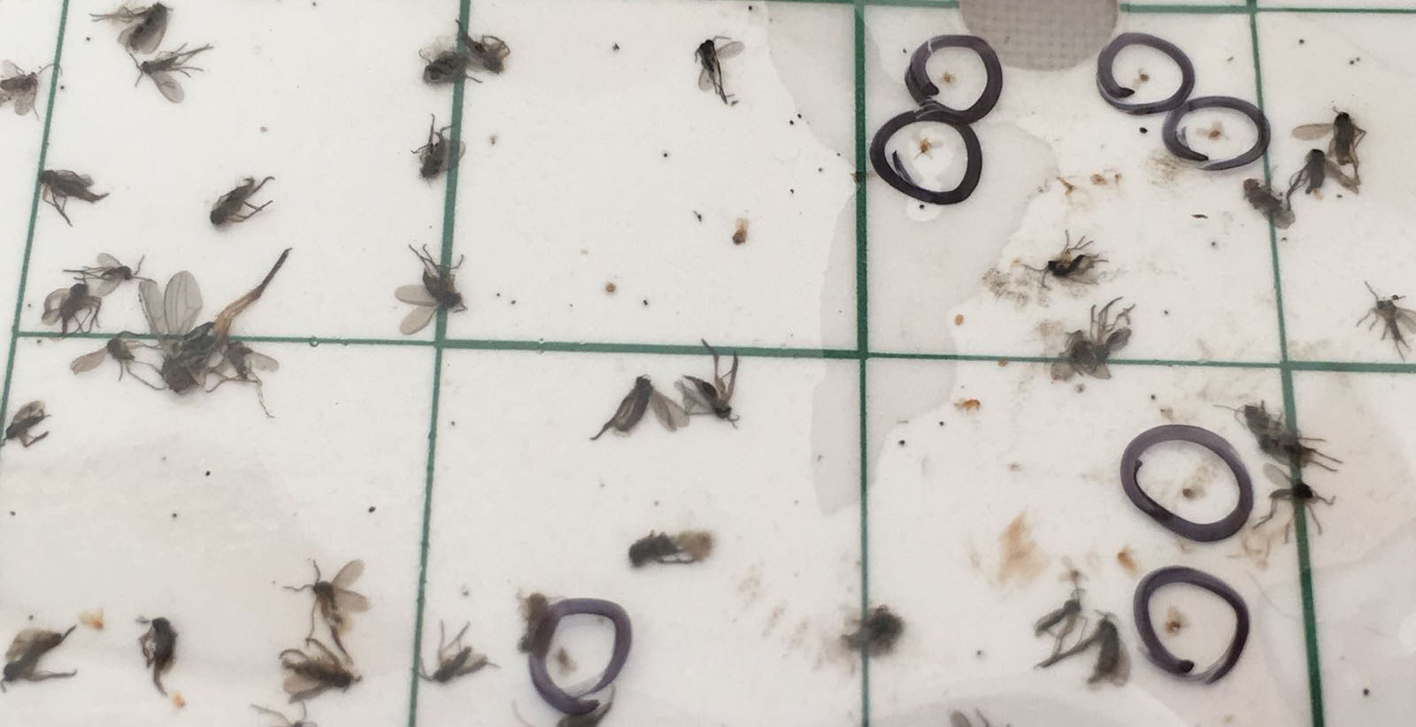 Dentro de los círculos, varios machos capturados durante los estudios hechos por NEVAL en una parcela que ha estado tratada con tratamientos convencionales, fitosanitarios.