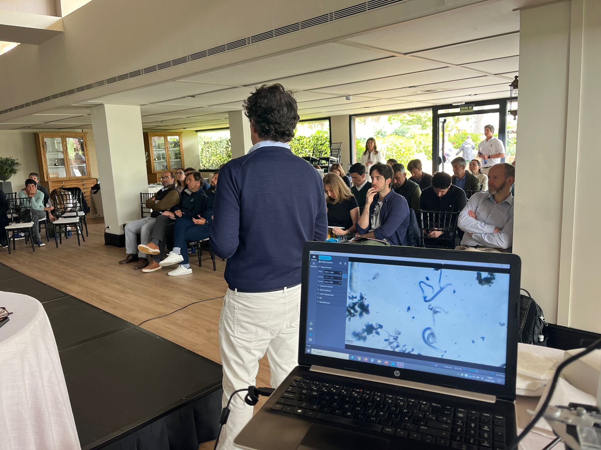 Kristell Santander cerró las Jornadas técnicas con la realización de una cuantificación e identificación en directo con nematodos, explicando la importancia de establecer umbrales para cada variedad de nematodo así como la de saber en un análisis el método de extracción empleado.